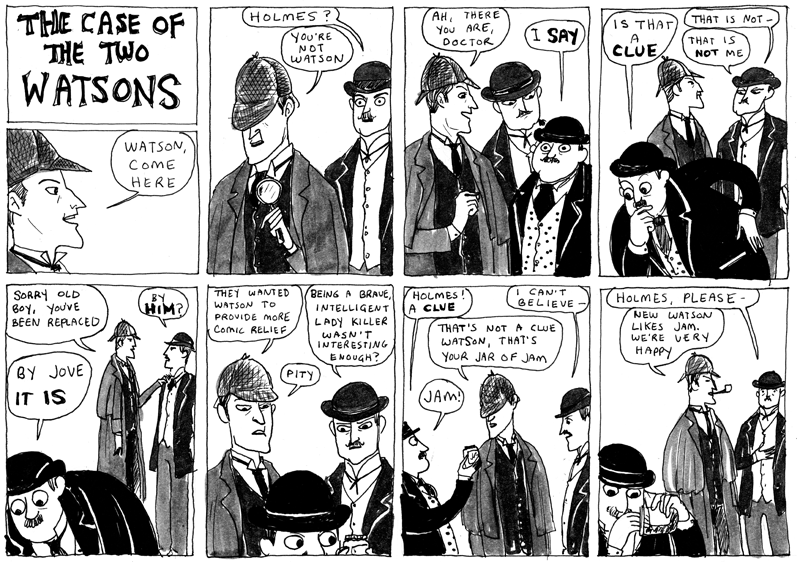 In the Case of Two Watsons, Beaton makes fun of the more modern version of Watson as a bumbling sidekick instead of the original intelligent, curious doctor and Holmes’ confidant.