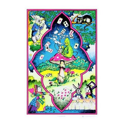 With these more socially accepted adaptations there has also been a cult following of Lewis Carroll and the story of, Alice In Wonderland, within in the drug culture. This topic has been largely ignored because the idea often seems laughable, but I think the manipulation of the text to fit the drug culture and implications of that manipulation proves interesting to the power of visuality combined with text or in addition to the text. (Below are images of backlight posters and a smoking caterpillar tattoo. Blacklight posters are often associated with drugs because of their ability to light up when triggered by a black light)