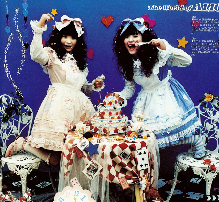 In Harajuku, Japan, one can see all kinds of high fashion in the streets. One of the many fashion crazes in Japan with teenagers and young women right now is called Lolita. This style is characterized by Victorian-era clothing (think petticoats, corsets, bonnetts, lace gloves and stockings) and often a head full of curls. The three main branches of Lolita are Gothic, Sweet, and Classic. The Sweet Lolita style evokes childlike innocence through the use of items associated with young girls: hair ribbons, stuffed animals, etc. It’s not suprising then that many followers of the Sweet Lolita persuasion cite Alice as their main style inspiration. The large hair bow is a favorite, and is called an Alice bow.
