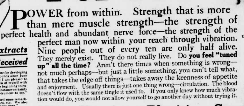 To the left is an early ad for the electric vibrator featured in the Sunday edition of The New York Tribune on January 5, 1913. It appears at the end of Part III (“The Sunday Magazine”) and right before Part IV (Financial, Real Estate, Music).