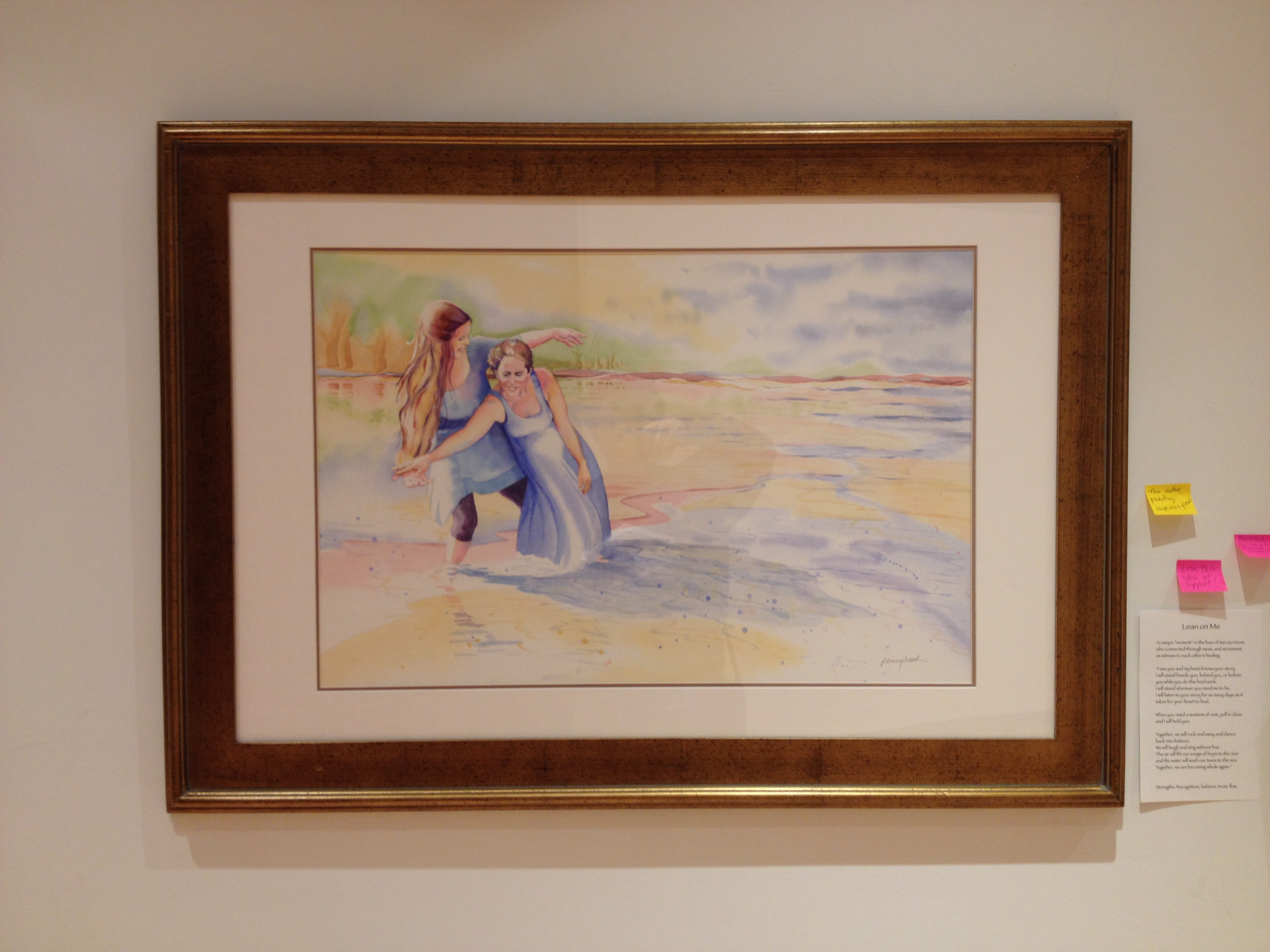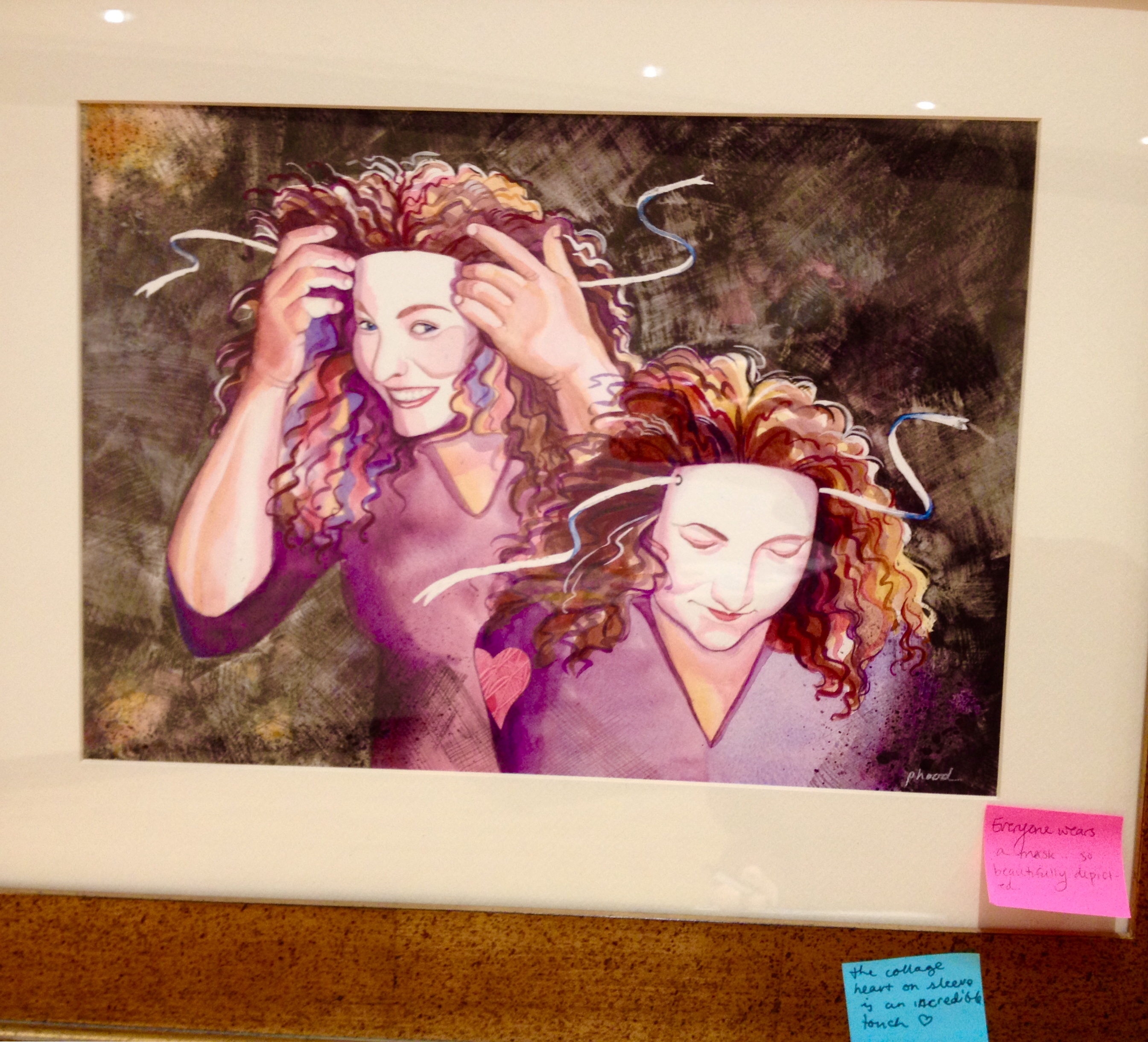 Upon walking into the lobby where the show hangs, you encounter a table full of brochures and flyers before you see the actual art. There’s information from Penny Hood herself regarding the show, but the MHC Counseling and Health Services, as well as student-led groups, have provided support and networking information about preventing, discussing, and healing from sexual assault and sexual violence. Although the art in this exhibit focuses on the experiences of specific individuals, the set up and exhibit as a whole focuses our attention and empathy towards the survivors around us. My favorite part was a basket full of post-it note pads, with an accompanying handwritten note from Hood: “Put a post-it on a painting — I will photograph your feedback for the subjects.” People left the kindest and most heartfelt notes on each of the 12 portraits. Some examples were