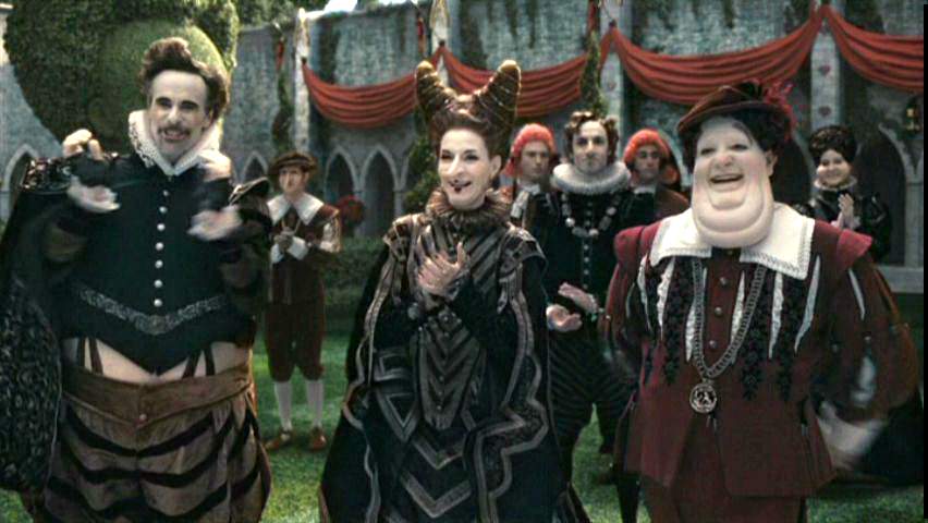 I’ll note that in this movie, Alice is among the only characters (or perhaps is really the only one) who look “natural,” and are without makeup, in Wonderland. I think that this helps separate her from her environment there, a place that she can’t logically belong to. Again, maybe it’s the workings of Alice’s mind that make these separations; establishing difference could be an underlying way to disassociate herself from any of the human (or human-like) characters in Wonderland.