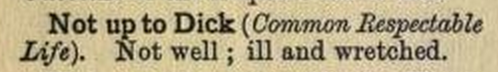 I prefer the common, polite Victorian way of saying someone isn’t feeling well (i.e., they really don’t want to see you) by saying, “Sorry, but my wife’s not the thing today.” (Young Jolyon, about his angry wife, said to his estranged father in Galsworthy’s The Forsyte Saga).