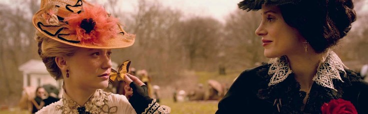 Edith and Lucille are foils both in personality and appearance. This contrast is played up with everything from the soft features, gentle brown eyes, and golden hair of Mia Wasikowska (Edith) to the intense blue eyes and striking dark hair Jessica Chastain (Lucille) dons for the role. Edith is young, 24, from New York, and she is in every way the quintessential metropolitan woman. Her father is a wealthy, self-made stonemason, and her clothes are tasteful but unquestionably expensive and modern. Edith is dressed exclusively in cream, gold, and bronze for the film’s first act, indicative of her wealth and comfort in the industry she lives in and around. Lucille is a bit older at 35, and next to Edith and the other young women from America, her English mannerisms and outdated dress style mark her as different. While the New York women wear the popular Edwardian leg-of-mutton sleeves and wide, looser skirts in lighter fabrics, Lucille remains in her heavy, dark velvet and constricting dresses that seem far more suited to an era twenty years previous.