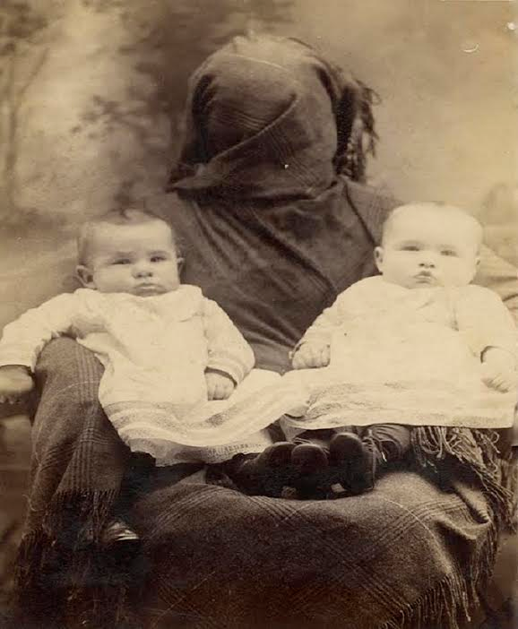 At the other end of the spectrum of photographed motherhood exists “Hidden Mother” photography. It is notorious mostly in retrospective; although it was a common practice at the time, it is the eerie tone which the images take on from a modern perspective which have ensured their longevity. Hidden mother portraits arose simply as an adaptation to the demands of Victorian photography in order to facilitate portraits of babies. Due to the length of the exposure time, often in addition to the unfamiliarity of the portrait studio, it was difficult to keep babies still long enough for portraits, but high infant mortality rates caused a demand for baby portraits. In order to do so, the baby would be sat on the mother’s lap, and a sheet would be placed over the mother – here, the mother is also draped in cloth, but unlike Cameron’s Madonnas, the face is not visible. A card was placed over the portrait such that the mother’s silhouette would be covered, and the sheet becomes at first glance simply a backdrop. However, upon removal of the card, the shrouded figure is revealed, creating a haunting picture. With some, it is nearly possible to read the figure as an oddly shaped chair; in others, the head is clearly visible under the sheet. In others still, the mother simply holds the child’s hand from behind a sheet, almost completely unnoticeable. It is difficult to say which of these are the creepiest in modern eyes (Bathurst).