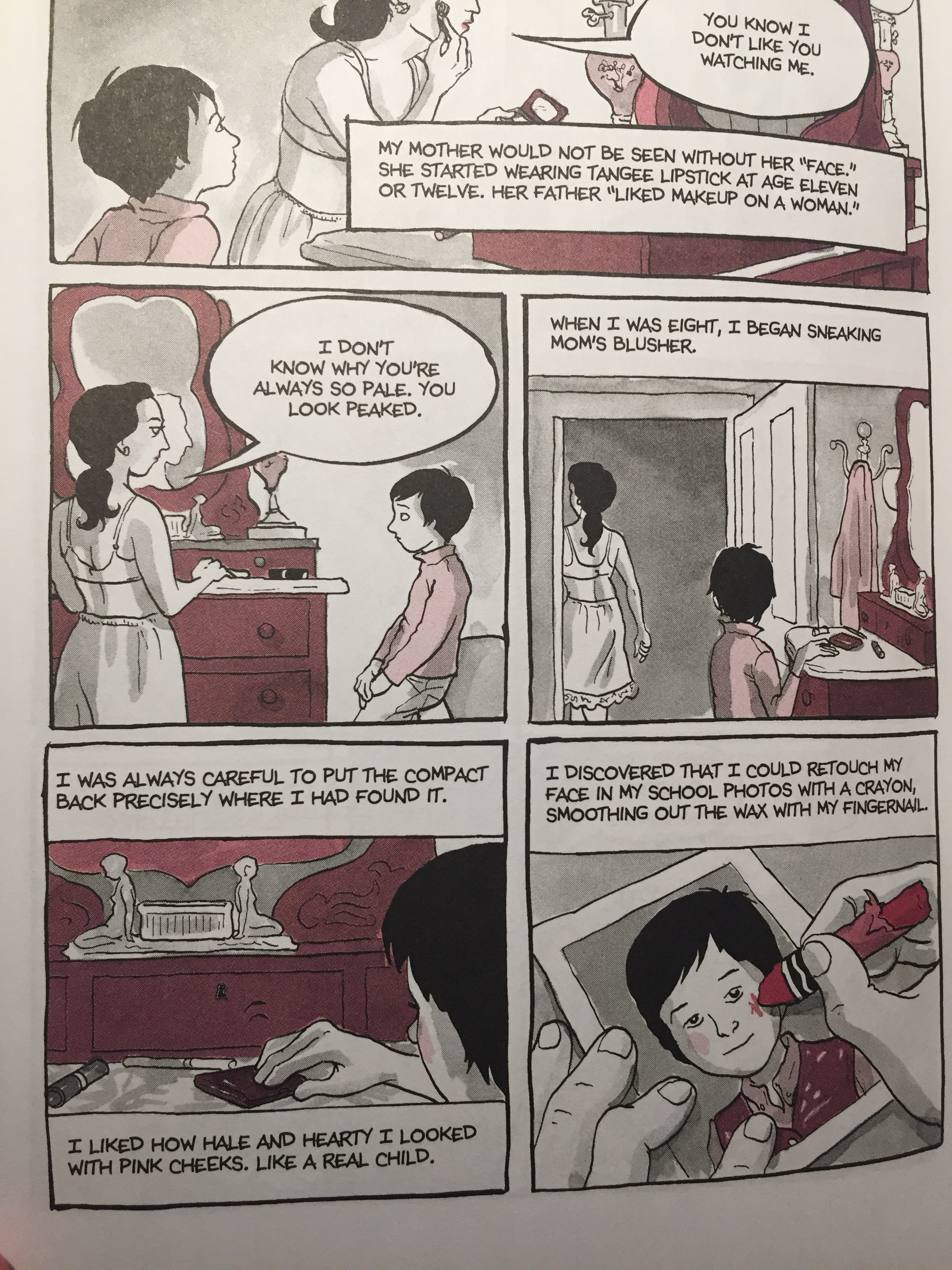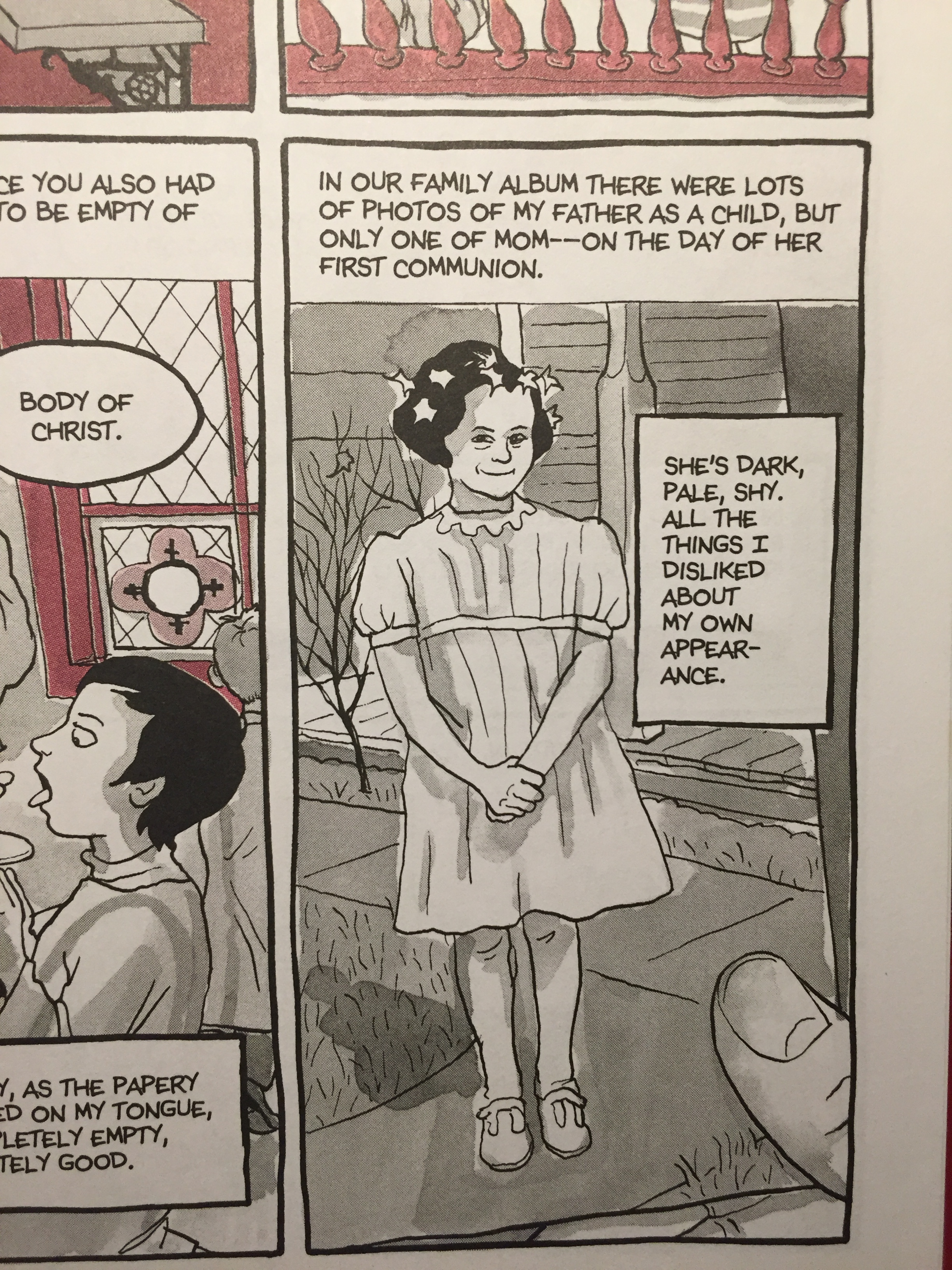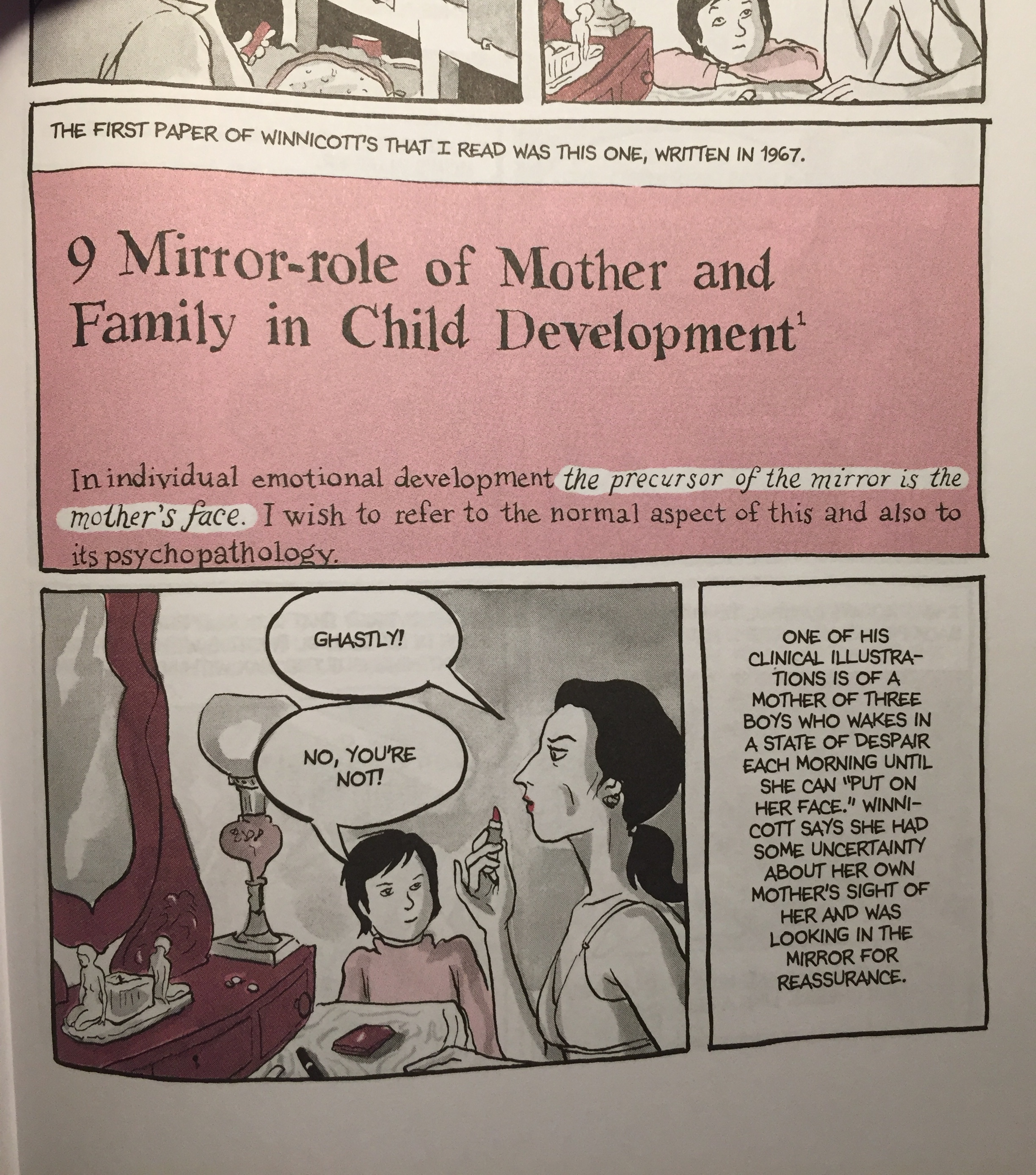 In a similar fashion, but with a slight reversal, Allison Bechdel writes in Are You My Mother?, a companion piece to her well-known memoir Fun Home, about her relationship with her mother, often utilizing the work of psychoanalyst Donald Winnicott as a lens to understand it. In Chapter 3, Bechdel draws in cartoon a picture of herself on her first communion at eight years old, and a picture of her mother’s first communion. A text box over this panel reads, “She’s dark, pale, shy. All of the things I disliked about my own appearance” (Bechdel 89). Later, in Chapter 6, Bechdel recounts a childhood memory of sitting in front of a mirror while her mother applies makeup. As her mother insults her own appearance, Allison reassures her. When her mother continues on to comment on Allison’s appearance (“I don’t know why you’re always so pale. You look peaked.”), Allison begins stealing her blush and tinting her school pictures with crayon (Bechdel 213-214). I am reminded strongly of the opening lyrics to Lucy Dacus’s “My Mother & I”: “My mother hates her body / we share the same outline / she swears that she loves mine” (Dacus). In Allison’s photographic search for her mother, she does not experience Barthes’ fragmented recognition of her figure, but rather a fragmented recognition of her own; furthermore, a flawed recognition of self, which inherits the anxieties and insecurities that predated one’s own existence. Bechdel interrupts her own narration in this chapter to make reference to Donald Winnicott’s paper “Mirror-Role of Mother and Family in Child Development”: “In individual emotional development, the precursor of the mirror is the mother’s face” (Bechdel 213).