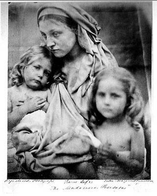 Julia Margaret Cameron’s portraits of Mary Hillier constitute a conflicted picture of motherhood. In these Madonnas, Hillier looks out of frame in three-quarters profile, or confrontationally at the camera, but rarely at the child she holds. In some ways, this Renaissance-styled neutral expression, coupled with averted gaze but intimate soft focus, aligns with the virgin Mary as representing both the epitome and antithesis of motherhood; sexually pure, but “androgynous” (Mavor 52). We can read in her expression a glowing love or a cold disinterest – is this the angel in the house, or do we read motherhood not inherently, but through photographic juxtaposition with the children she holds? At the same time, another tension exists between the referent and the metaphor. Mary Hillier was Cameron’s maid, and although many of these photos possess a painterly quality in pose, expression, and costume, there is no escaping the immediacy of the photograph. Unlike a painting of the virgin Mary, there is a failure of that imaginative extra step which lays claim to translation and transformation of the subject. In other words, the distance between model and Mary in a photograph is much narrower than that which exists between model and Mary in a painting. Like Mavor says, Cameron’s portraits “verge on sacrilege” (Mavor 47). Mary Hillier impersonates and interposes the virgin Mary, in an imitation that feels at once both cheap and profound. Motherhood in these photos is “altared” (Mavor 50), raised up to unmeetable and virginal expectations, but also grounded in the reality of a maid posing in costume with children who may not even be her own. Cameron’s Madonna portraits are to the virgin Mary as Victorian mothers were to that angel of the house; the halo is scratched onto the plate.
