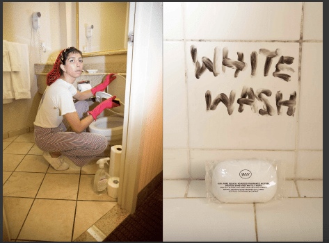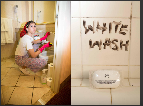 Gutierrez’s commentary on the imperialist ideology of soap is made more effective by the image on the opposite page. While not expressly a single, full-page spread the motif of the bathroom tiles in both images suggests their connection. On the left hand side of the page is this image of Gutierrez dressed as a maid, cleaning what appears to be a hotel bathroom. This image would never appear in a traditional soap ad because it reflects the reality of domestic labor, especially women’s labor and most especially the labor of women of color. As McClintock writes in her introduction “To begin a social history of soap, then, is to refuse, in part, to accept the erasure of women’s domestic value under imperial capitalism” (McClintock 209). This erasure is so complete that many people today expect never to see the people, mostly women, who clean their spaces especially in a place as carefully orchestrated as a hotel. By reintroducing the image of the domestic laborer alongside a cleaning product, Gutierrez refuses to participate in this erasure. She calls attention not only to the racist legacy of soap but to the continued exploitation of women of color in domestic labor.