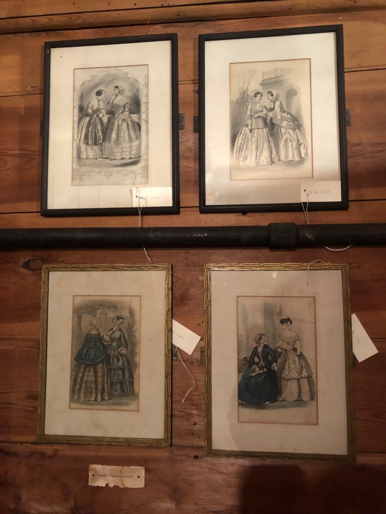 I also went down to the basement (it’s as creepy as it sounds; there’s a collection of antique baby carriages that look so haunted). On the wall near the stairs there’s a set of four mid-19th century fashion plates. Next to them is a cartoon titled “Sailors on Shore” which appears to be from around the same time. I couldn’t make out the text of the cartoon so I’m not sure exactly what it’s meant to satirize but the way the figures are drawn reminded me of the article on Irish political cartoon styles.