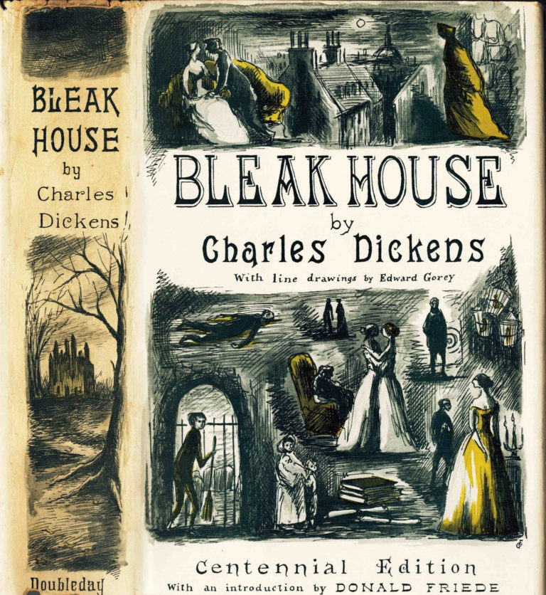 While Edward Gorey was not alive during the Victorian era (he was born in 1925 and died in 2000), his work often portrays Victorian settings and characters, and in fact he did cover illustrations for various books including Bleak House. He also wrote many books, often formatted like children’s picture books, that depict individuals in Victorian dress meeting dark, gruesome fates. For instance, his 1963 picture book The Gashlycrumb Tinies, or, After the Outing is a rhyming alphabet book telling of the grisly deaths of 26 young children, many of whom look as though they could be characters in a story like Bleak House or Alice in Wonderland. The book begins, “A is for Amy who fell down the stairs; B is for Basil assaulted by bears. C is for Clara who wasted away; D is for Desmond thrown out of a sleigh.” The book continues through the whole alphabet, with each section accompanied by an ink drawing of the death in question. The violent content and dark, sketchy illustrations contrast with the expectations one would typically have of an alphabet book, creating a chilling overall effect.