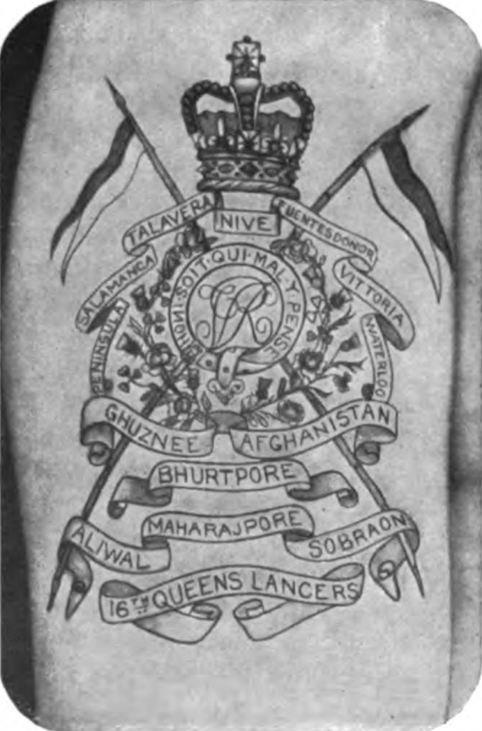 Macdonald primarily tattooed men, but not exclusively. In fact, he was known for being able to realistically tattoo blush on the face, and women went to him specifically for this early form of cosmetic tattooing. Military men and royalty both came to him for insignia and crests, serving as both status symbols and, for soldiers, as identifying marks in case of death. Macdonald tells the story of a client who survived the sinking of the SS Drummond Castle in 1896 and during this near-death experience had decided to have “some distinguishing tattoo mark placed upon him, so that in future he could be identified easily in case of an accident.” This man ultimately had his name and address tattooed by Macdonald. Tattooing as a means of identification was in the public eye at the time, as the Tichborne case (where a man claimed to be the missing heir of the Tichborne Baronetcy) had just been settled on the basis of the true heir being known to have distinguishing tattoos.