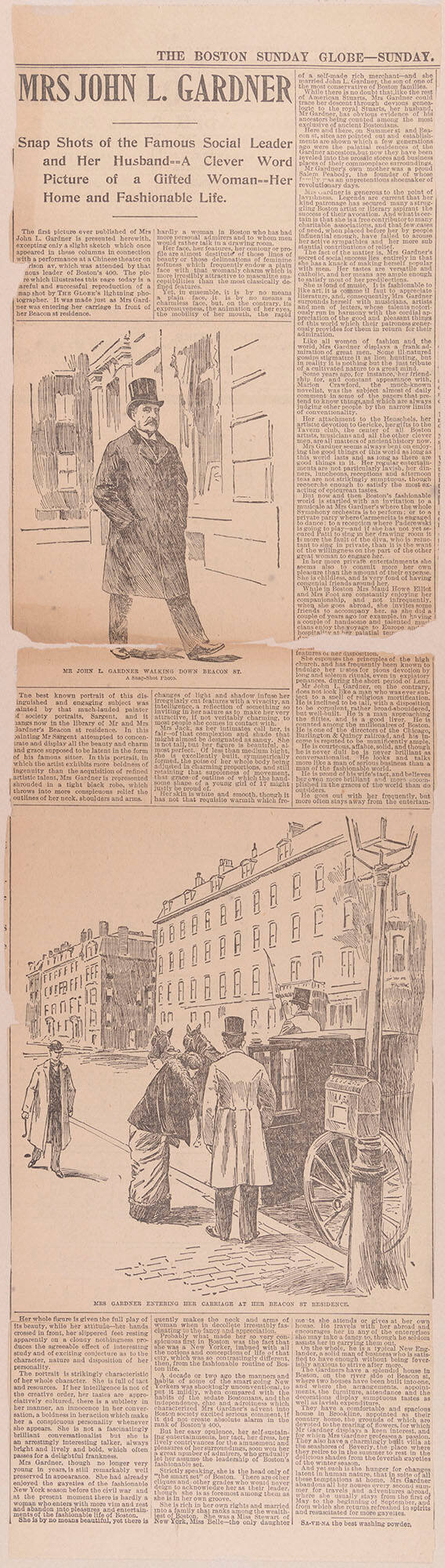 “Mrs. John L. Gardner: Snap Shots of the Famous Social Leader and Her Husband,” The Boston Globe, 1 April 1894, printed ink on newspaper.