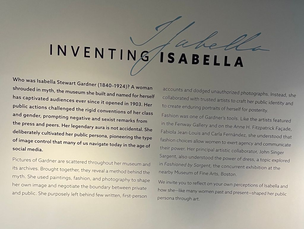 The cherry on top to my visit was the all-new exhibit that had just made its debut only a month prior in October. This exhibit, titled “Inventing Isabella,” was about the museum’s enigmatic namesake herself. After reading the wall panel outside the Hostetter Gallery’s entrance, I had to stifle a laugh because of just how perfectly applicable—almost to an eerie degree—this exhibit’s content was to the themes of our course.