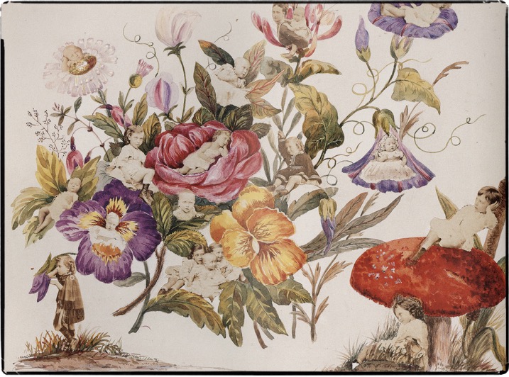 This Wonderland, then, is constituted in much the same way as a collage. The connection between the two is perhaps most easily visible in Crowley’s set for the scene in which Alice first enters the garden. Painted flowers border the scene, lowered in front of the background of falling letters. Most notable is the face of a child nestled in the central flower, which is painted, though it gives the impression that it was cut and pasted from a different source than the flowers were. This calls to mind a photocollage from Alexandra, Princess of Wales, in which children were cut out of photographs and arranged on painted flowers.