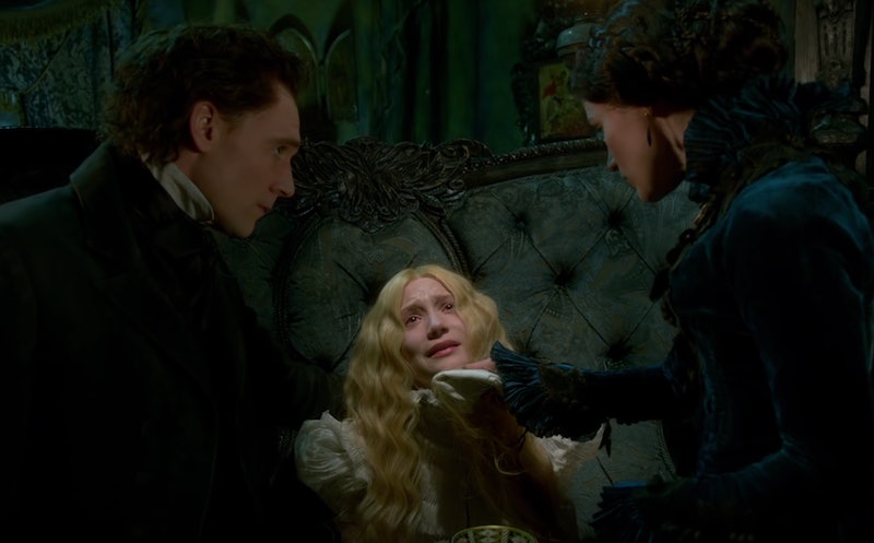 Some brief background on the film: It follows the bright (in both mind and color scheme) Edith Cushing, an American woman and aspiring writer. She is pulled into the dim and dangerous world of the Sharpe siblings, the very last of a crumbling line of minor aristocrats. There are, of course, ghosts, murder, and dark traumatic pasts abound. It is set at the very cusp of the Victorian and Edwardian eras, and straddles the line between the archaic and modern in its characters, narrative, and visual associations. The film plays deliberately with the themes, tropes, and images associated with the era, relying on not just a historical familiarity with the Victorians but a cultural familiarity/knowledge of our modern engagement with the era and its resonances.
