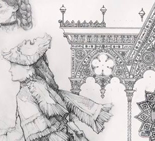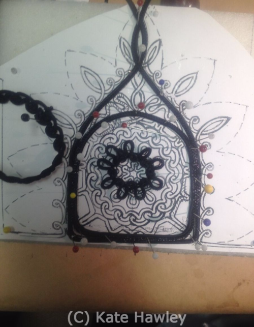 The costuming of Lucille Sharpe. The color palette and form of Lucille’s gown visually ties her to the house. The center photo shows progress on passementerie used for Lucile’s costumes, the design recalling the shapes of Allerdale Hall itself.