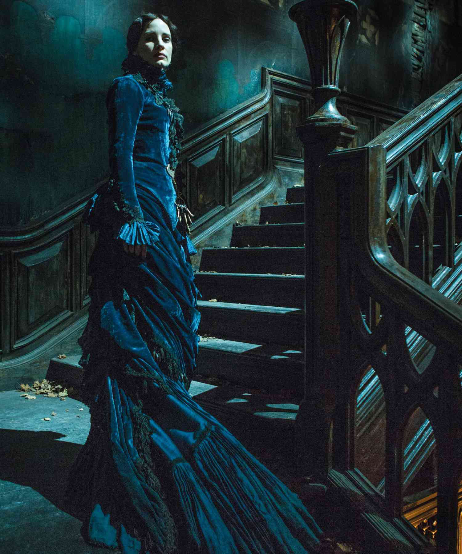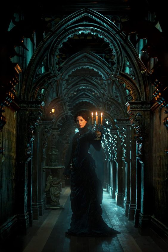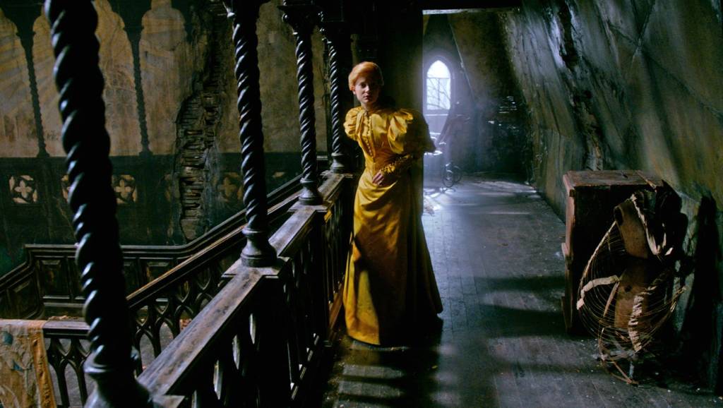 Edith furtively moves through Allerdale Hall, wearing her “Nancy Drew” dress during her investigative escapades. The otherwise dull light catches on her soft and gold silhouette, shimmering and dissonant with the set.