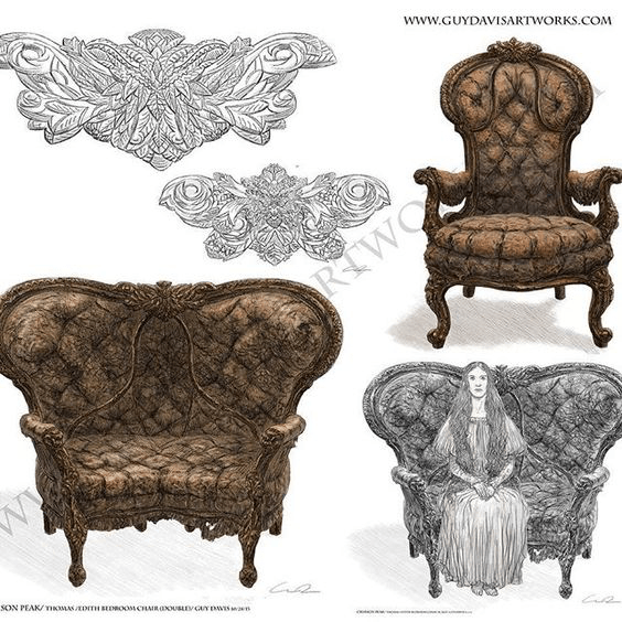 Concept art of the wallpaper in Allerdale Hall by Guy Davis. The word “fear” is worked into the moth-like shapes, almost imperceptibly, via https://www.instagram.com/guydavis.art/.