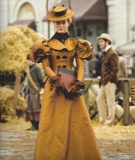 Most of Edith’s dresses could be more accurately dated to 1895-1899 rather than 1901, when the puff on the sleeve begins to drop and the front of the bodice gains body in the pigeon-breasted silhouette. She is clearly evocative of this late 1890’s modern woman, the type you might see on cycling advertisements that remind one of the era’s feminist discourses. Hawley seems to be directly inspired by these images and the associated type of woman. Edith is seen with a bicycle in one sketch, and in the film she recalls women’s shifting place in the workforce as she types her manuscript in an office, bespectacled, looking to improve her chance of being published by modifying her perception.